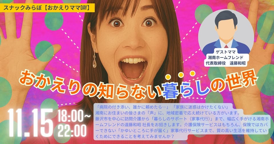 ▼みらぼへのご来店が初めての方は、事前のメンバー登録のご協力をお願い致します。 https://snack-melabo.com/#membership . ●事前登録をして頂きましたら、他に予約等は必要ないので、当日コアタイムまでにお越し下さい✨ ●参加ボタンで参加をお知らせして下さると嬉しいです🥰 . ------------------------------- . ※土曜日ですので18時オープン22時クローズとなります。 ※この日のコアタイムは、19時~です。 . 岡えりママの知らない世界シリーズ🌎 今回のテーマは・・・ 『おかえりの知らない【暮らし】の世界』 湘南の「ちょっと困った」を解決! ~地域のプロが教える「安心な暮らし」を諦めない秘訣~ . . 「病院の付き添い、誰かに頼めたら…」 「介護サービスを頼むほどではないけれど、暮らしの中で感じる“ちょっとした不便”。」 「家族に迷惑はかけたくない」 . 湘南にお住まいの皆さまの「声」に、地域密着で応え続けている方がいます。 . 今回は、藤沢市を中心に訪問介護から「暮らしのサポート(家事代行)」まで、幅広く手がける湘南ホームフレンドの遠藤和昭 社長をお招きします。 . 介護保険サービスはもちろん、保険ではカバーできない「かゆいところに手が届く」家事代行サービスまで、質の高い生活を維持していくためにできることを考えてみませんか? . . ◇ゲストママ 湘南ホームフレンド 代表取締役 遠藤和昭 社長 http://www.homefriend.co.jp/ . ◇担当ママ 株式会社Lively 代表取締役社長 CEO 岡えりママ https://snack-melabo.com/mamas/okaeri/ . ●LivelyTalk(ライブリートーク)とは? 1対3までの少人数に特化したライブコミュニケーションサービスです https://www.lively-talk.com/service . . ▼岡えりママのイベントアーカイブはこちら ✅https://www.instagram.com/p/DHGChfYPC0c/?img_index=1 ✅https://snack-melabo.com/2024/06/28/20240518-okaerimama/ . . 営業時間◆18:00~22:00 イベントコアタイム◆19:00~20:00 上記時間以外はフリートーク・交流タイム! . 料金システム◆ドロップインチャージ1000円+飲み放題2500円〜 ボトル支援5000円~ . ▼料金システムの詳細はこちらから https://snack-melabo.com/howto/ . . ▶ドリンクメニューは、無制限飲み放題。 フードメニューはございません。 お食事をお済ませいただいてからご来店いただくか、 +¥300でお食事お持ち込み可能です。 (ゴミの処分はこちらで承ります。) . ※お支払いは、現金、各種キャッシュレス決済可 (領収書発行致します。) . 皆様のご来店をお待ちしております🌹