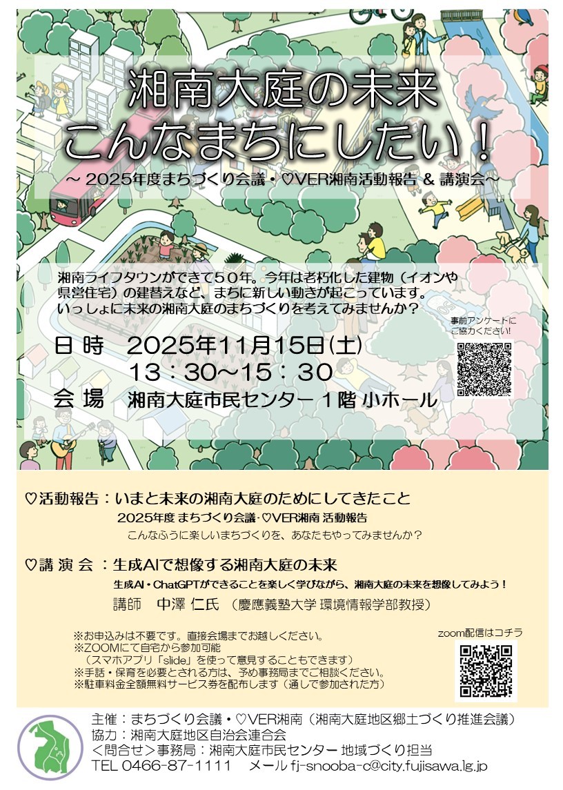 湘南大庭地区のまちづくり会議(郷土づくり推進会議) 2025年度活動報告と慶應義塾大学 環境情報学部 中澤 仁 教授を講師に迎え、 湘南大庭の未来を生成AIも使って皆さんと一緒に創造してみたいと思います。