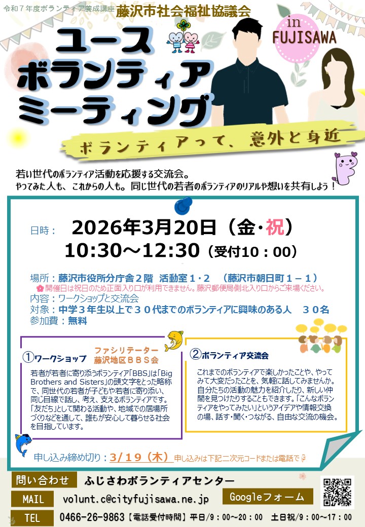 若い世代のボランティア活動を応援する交流会。 やってみた人も、これからの人も。同じ世代の若者のボランティアのリアルや想いを共有しよう! 場所:藤沢市役所分庁舎2階 活動室1・2 (藤沢市朝日町1-1) 🌸開催日は祝日のため正面入り口が利用できません。藤沢郵便局側北入り口からご来場ください。 内容:ワークショップと交流会 対象:中学3年生以上で30代までのボランティアに興味のある人 30名 参加費:無料 申込URL:https://forms.gle/fa1giPprUgfoRhZn7 締切:3/19(木) 問合せ:ふじさわボランティアセンター ☎0466-26-9863 MAIL:volunt.c@cityfujisawa.ne.jp