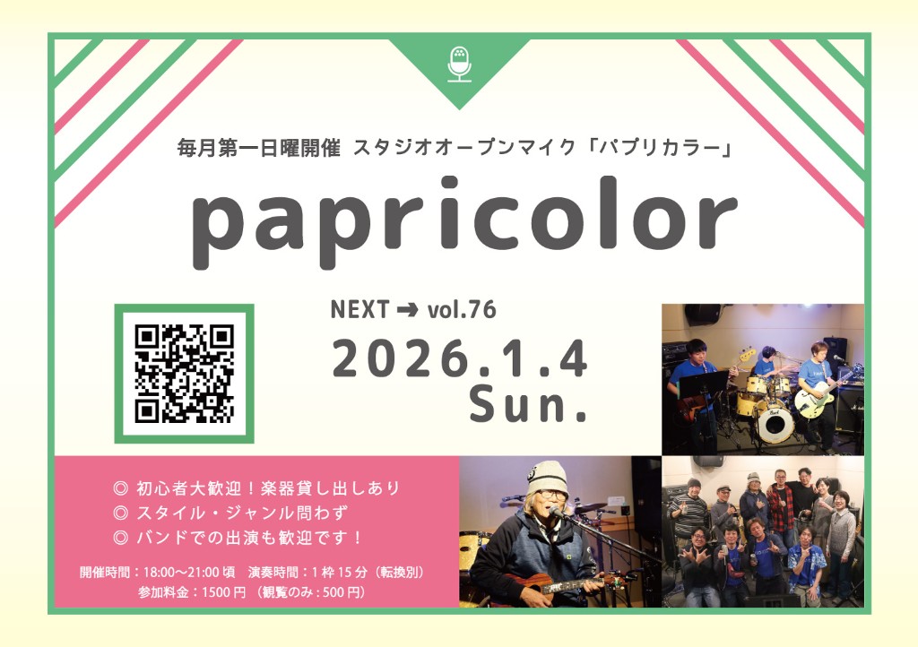 初心者大歓迎!手ぶらでも参加出来るアットホームなイベントです。 パプリカミュージックスタジオ毎月第一日曜日恒例イベントは初心者から経験者までゆるりと演奏が楽しめるオープンマイク「papricolor」! 弾き語りでも、バンドでも、ラップでも、パントマイム(もはやマイクではない)でも、まさに表現の自由を謳歌出来るハッピーなライブイベントです。 --- ▼エントリー https://paprica.studio/item/papricolor-vol-76/ 演奏参加:1500円/1名 観覧のみ:500円/1名 ・お申し込みを頂き次第エントリー確定とさせていただきます。基本的に折り返しのご連絡は省略させていただいておりますので、そのまま当日お越しください。 ・観覧のみの方 はご予約不要です。 当日受付にお申し付けください。 5名以上のグループ等でお越しの場合は事前にご一報頂けると安心です。 ・駐車場は一般のスタジオ予約のお客さまがご利用になる為、オープンマイクご参加の方はお使い頂けません。 コインパーキング等をご利用ください。 --- ▼ツイキャス無料配信あり https://twitcasting.tv/paprica_studio ・出演時、配信や撮影を希望されない場合はお申し付けください。