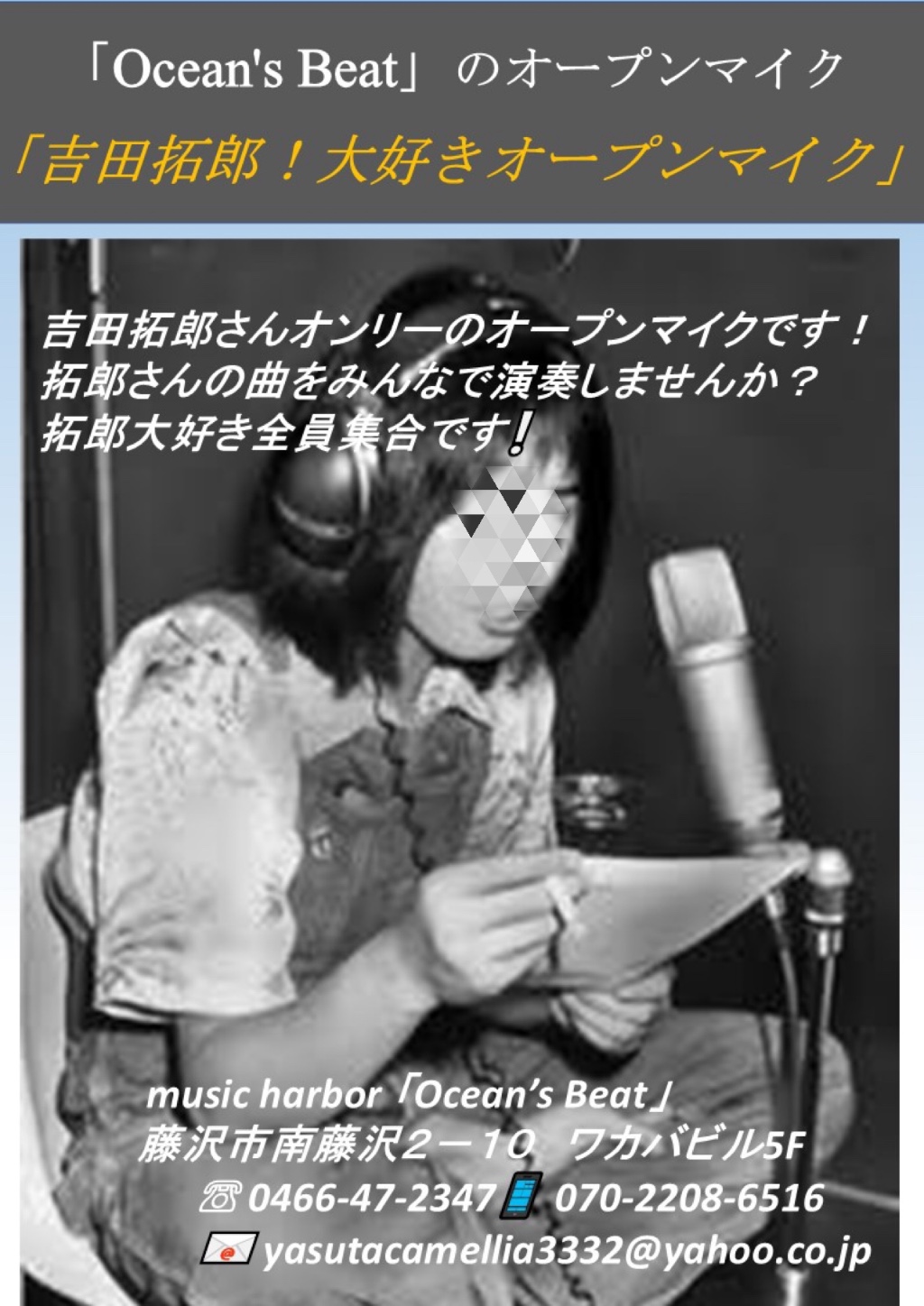 第5水曜日です 「吉田拓郎!大好きオープンマイク}を企画いたしました 拓郎さんの大好きな方々が集まって2曲回しで、歌い上げます! かぶりもOK! みんなで拓郎さんを大合唱しませんか? 料金は通常料金です TC1,000円+飲んで食べて代