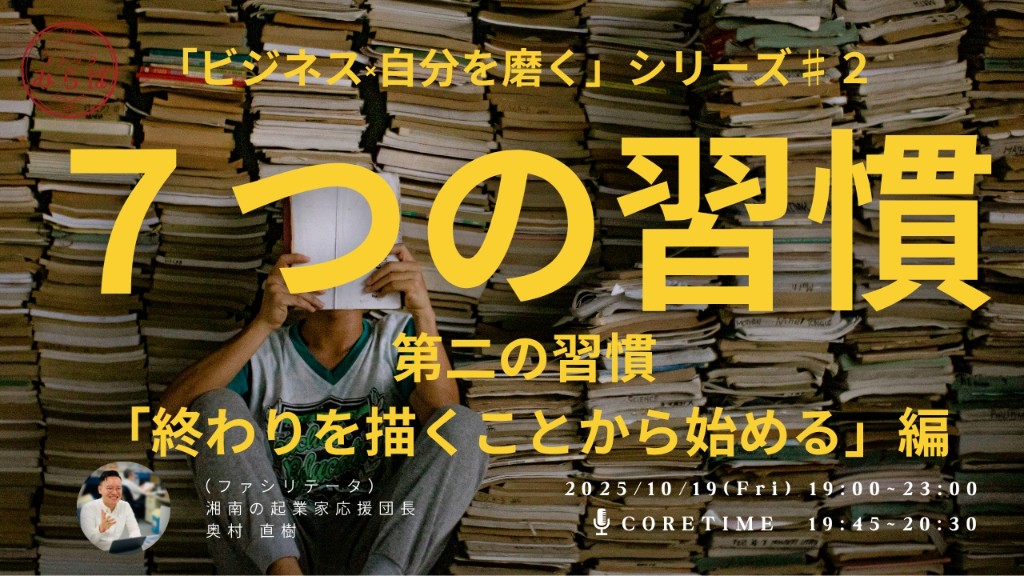 ▼みらぼへのご来店が初めての方は、事前のメンバー登録のご協力をお願い致します。 https://snack-melabo.com/#membership . ●事前登録をして頂きましたら、他に予約等は必要ないので、当日コアタイムまでにお越し下さい✨ ●参加ボタンで参加をお知らせして下さると嬉しいです🥰 . ------------------------------- . ※この日のコアタイムは19:45~20:30になります。 . 中小企業診断士・社会保険労務士 奥村ママの🌹NEWシリーズ🌹✨ . テーマは・・・ 『「ビジネス・自分を磨く」シリーズ#2 【7つの習慣】~第二の習慣「終わりを描くことから始める」編~』 . . \奥村ママより/ . このワークショップは、ただの読書会ではありません。 . 世界的ベストセラー『7つの習慣』をベースに、毎回一つの「習慣」を深掘りし、あなたのビジネスに直結する実践的なスキルに落とし込みます。 . 「予習は不要!途中参加も大歓迎です」 . 本を読んでいなくても大丈夫。各回が独立したテーマになっているので、興味のある回にいつでも気軽に参加できます。もし書籍をお持ちの方は、ぜひご持参ください。より理解を深めることができます。 . ママが投げかける問いをもとに、参加者同士で具体的なケーススタディを「壁打ち」し合う実践の場です。自分の言葉で話すことで、考えが整理され、あなたが抱える課題を解決する糸口がきっと見つかります。 . ▼7つの習慣 https://amzn.asia/d/e57KUsP . . ◆担当ママ 湘南労務経営 代表 中小企業診断士 社会保険労務士 奥村直樹ママ https://snack-melabo.com/mamas/okumura/ . . ▼奥村ママのイベントアーカイブはこちら ✅https://www.instagram.com/p/DIdkZT9vTF0/?img_index=1 ✅https://snack-melabo.com/2024/04/23/240418okumura-mama/ ✅https://snack-melabo.com/2025/02/16/240719-okumuramama/ ✅https://snack-melabo.com/2024/04/23/240418okumura-mama/ ✅https://snack-melabo.com/.../30/yamaguchimama-okumuramama/ ✅https://snack-melabo.com/2022/11/21/okumura-mama1118/ . . 営業時間◆19:00~23:00 イベントコアタイム◆19:45~20:30 上記時間以外はフリートーク・交流タイム! . 料金システム◆ドロップインチャージ1000円+飲み放題2500円〜 ボトル支援5000円~ . ▼料金システムの詳細はこちらから https://snack-melabo.com/howto/ . . ▶ドリンクメニューは、無制限飲み放題。 フードメニューはございません。 お食事をお済ませいただいてからご来店いただくか、 +¥300でお食事お持ち込み可能です。 (ゴミの処分はこちらで承ります。) . ※お支払いは、現金、各種キャッシュレス決済可 (領収書発行致します。) . 皆様のご来店をお待ちしております🌹