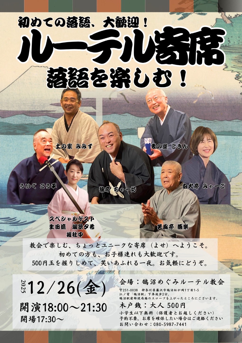 笑い納めは、海風そよぐ鵠沼で。 教会の温もりに包まれて、心も体もほぐれる落語のひとときを。 藤沢・鵠沼で、心温まる年末の落語会「ルーテル寄席」を開催します! 落語が初めての方も大歓迎。どなたでも気軽に、古典の世界と笑いの深さを楽しめる会です。 会場は、鵠沼めぐみルーテル教会。 地域の方々が集い、笑いを分かち合う「場」として、 そして一年を締めくくる癒しの時間としてお過ごしください。 📅 開催情報 日程:2025年12月26日(金) 開場:17:30 開演:18:00 終演予定:20:30 会場:鵠沼めぐみルーテル教会 〒251-0038 神奈川県藤沢市鵠沼松が岡1丁目1-6 (江ノ電「鵠沼駅」徒歩2分・鵠沼駅前郵便局脇のスロープ上) 💴 木戸銭(参加費) 大人:500円(当日会場にて現金支払い) 小学生以下:無料(※保護者同伴でご来場ください) 🎙️ 番組表 18:00〜 一、落語 白犬亭 みゃーご 一、音曲噺 - ゆうれい屋敷 ういぐ こう平 一、落語 土の家 みみず 一、落語 笑風亭 酒樂 お仲入り 19:45頃〜 一、芝浜 麦の屋 こきん 一、三味線 スペシャルゲスト 生田流 堀歌夕希・掘社中 一、黄金の大黒 鵠亭 ちゃー坊
