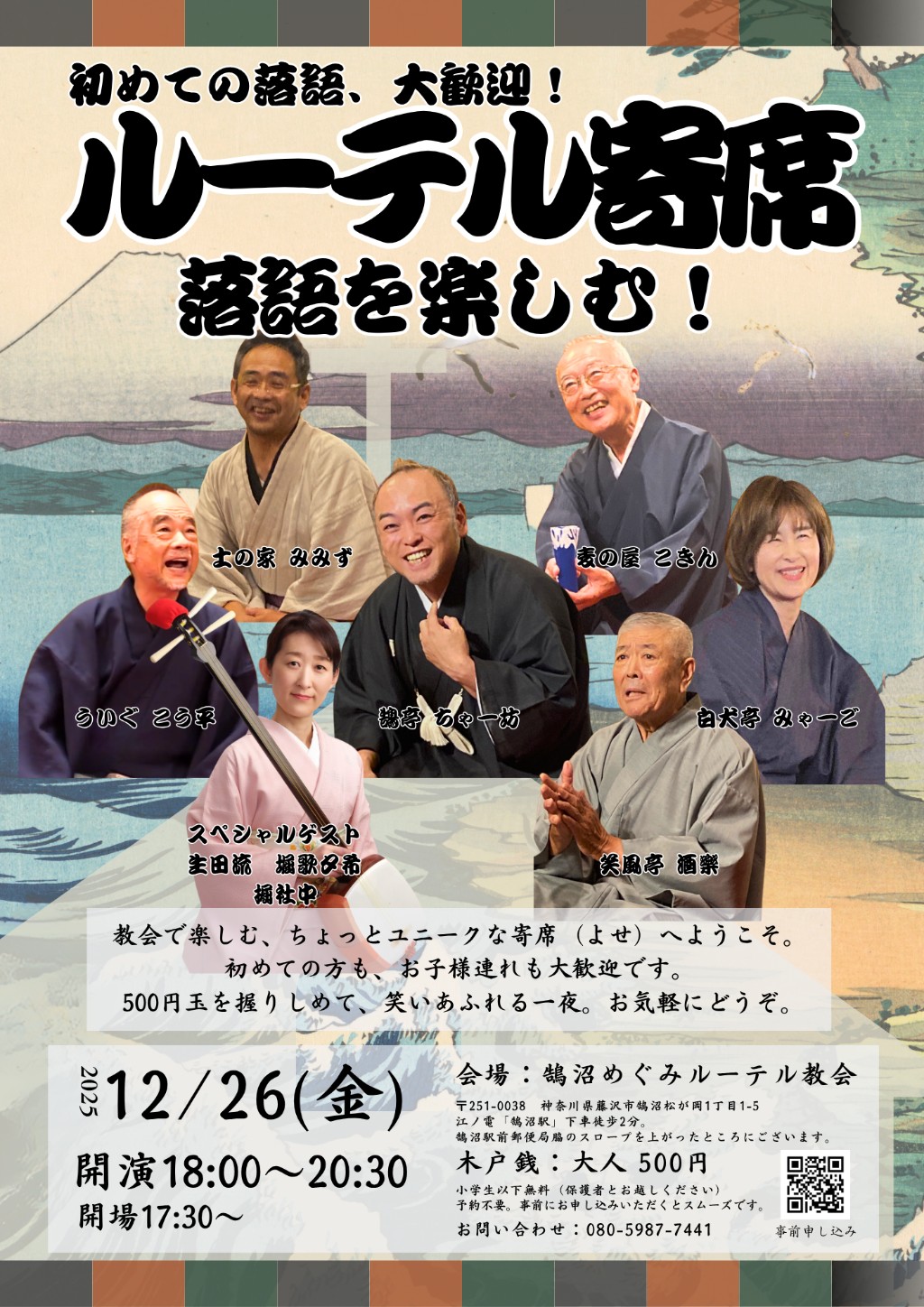 笑い納めは、海風そよぐ鵠沼で。 教会の温もりに包まれて、心も体もほぐれる落語のひとときを。 藤沢・鵠沼で、心温まる年末の落語会「ルーテル寄席」を開催します! 落語が初めての方も大歓迎。どなたでも気軽に、古典の世界と笑いの深さを楽しめる会です。 会場は、鵠沼めぐみルーテル教会。 地域の方々が集い、笑いを分かち合う「場」として、 そして一年を締めくくる癒しの時間としてお過ごしください。 📅 開催情報 日程:2025年12月26日(金) 開場:17:30 開演:18:00 終演予定:20:30 会場:鵠沼めぐみルーテル教会 〒251-0038 神奈川県藤沢市鵠沼松が岡1丁目1-6 (江ノ電「鵠沼駅」徒歩2分・鵠沼駅前郵便局脇のスロープ上) 💴 木戸銭(参加費) 大人:500円(当日会場にて現金支払い) 小学生以下:無料(※保護者同伴でご来場ください) 🎙️ 番組表 18:00〜 一、落語 白犬亭 みゃーご 一、音曲噺 - ゆうれい屋敷 ういぐ こう平 一、道具屋 土の家 みみず 一、落語 笑風亭 酒樂 お仲入り 19:45頃〜 一、芝浜 麦の屋 こきん 一、都々逸・尺八・三味線 スペシャルゲスト 生田流 堀 歌夕希・掘社中 一、黄金の大黒 鵠亭 ちゃー坊 堀社中 都々逸【潮来出島】【三千世界】 疋田 岑好 尺八【月光弄笛】 内海 昭 三味線二重奏【春景八章】 江頭 志津子 宮川 安子 今井 まみえ 堀 歌夕希