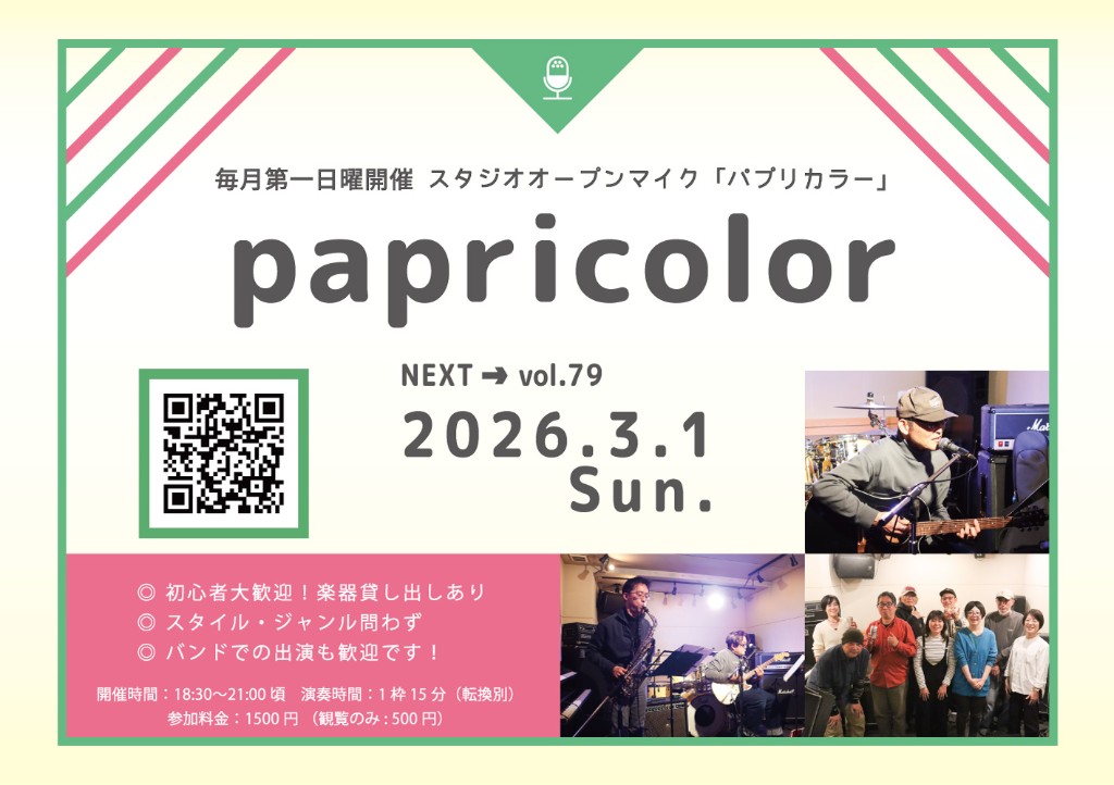初心者大歓迎!手ぶらでも参加出来るアットホームなイベントです。 パプリカミュージックスタジオ毎月第一日曜日恒例イベントは初心者から経験者までゆるりと演奏が楽しめるオープンマイク「papricolor」! 弾き語りでも、バンドでも、ラップでも、パントマイム(もはやマイクではない)でも、まさに表現の自由を謳歌出来るハッピーなライブイベントです。 --- ▼エントリー https://paprica.studio/item/papricolor-vol-79/ 演奏参加:1500円/1名 観覧のみ:500円/1名 ・お申し込みを頂き次第エントリー確定とさせていただきます。基本的に折り返しのご連絡は省略させていただいておりますので、そのまま当日お越しください。 ・観覧のみの方 はご予約不要です。 当日受付にお申し付けください。 5名以上のグループ等でお越しの場合は事前にご一報頂けると安心です。 ・駐車場は一般のスタジオ予約のお客さまがご利用になる為、オープンマイクご参加の方はお使い頂けません。 コインパーキング等をご利用ください。 --- ▼ツイキャス無料配信あり https://twitcasting.tv/paprica_studio ・出演時、配信や撮影を希望されない場合はお申し付けください。