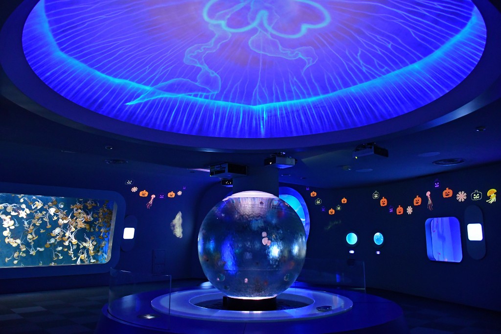 ハロウィン装飾を施した季節限定のクラゲファンタジーホール。幽霊のようにゆらゆら壁面を漂うユウレイクラゲにもご注目!