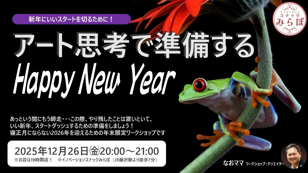▼みらぼへのご来店が初めての方は、事前のメンバー登録のご協力をお願い致します。 https://snack-melabo.com/#membership . ●事前登録をして頂きましたら、他に予約等は必要ないので、当日コアタイムまでにお越し下さい✨ ●参加ボタンで参加をお知らせして下さると嬉しいです🥰 . ------------------------------- . ※この日のコアタイムは20:00~になります。 . . ▼なおママより . 気づけば、今年ももう終わり。 年末年始は、つい流れに身を任せてしまいがちですが、 ほんの少し立ち止まって「準備」するだけで、新年のスタートは大きく変わります。 . このワークショップは、 2026年を“がんばって始める”のではなく、 気持ちよく、跳ねるようにスタートするための準備の時間です。 . 使うのは、Points Of You® の写真カード。 言葉よりも先に、色やイメージ、直感に触れながら、 2026年の自分を静かに、でも鮮明に思い描いていきます。 . ・どんな自分で一年を過ごしたいのか ・どんな変化が起きてほしいのか ・どんな出来事を引き寄せたいのか . この場では、目標も、変化も、起こることすべてを 「すでに起きた未来」として予祝します。 先に祝うことで、心と行動が自然とその未来に向かって動き出します。 . ワークの最後には、 「年始にまず何をするか」 をひとつだけ決めます。 大きな計画ではなく、スタートダッシュのための“最初の一歩”です。 . 👇こんな方におすすめです! ・2026年を良い流れで始めたい方 ・年始に立てた目標がいつも曖昧になってしまう方 ・直感やイメージを大切にした未来づくりをしてみたい方 ・新年を迎える前に、気持ちを整えておきたい方 . 跳ぶ前のカエルが、じっと力をためているように。 この時間は、あなた自身が未来に向けて踏み切るための準備です。 . 慌ただしい年末だからこそ、 静かで、カラフルなひとときを。 2026年のスタートダッシュを、一緒につくりましょう✨ . . ◇担当ママ 合同会社エムシースクエア代表 ワークショップ・プロデューサー/研修講師 山口直ママ https://snack-melabo.com/mamas/yamaguchi/ . ▼なおママのアーカイブはこちら https://snack-melabo.com/2025/02/21/240724-naomama/ https://snack-melabo.com/2024/06/28/240412-yamaguchimama/ https://snack-melabo.com/2024/02/16/240209yamaguchi-mama/ https://snack-melabo.com/2024/01/15/yamaguchimama/ https://snack-melabo.com/2023/02/01/230112-naomama/ https://snack-melabo.com/2023/08/30/yamaguchimama-okumuramama/ . 営業時間◆19:00~23:00 イベントコアタイム◆20:00~21:00 上記時間以外はフリートーク・交流タイム! . 料金システム◆ドロップインチャージ1000円+飲み放題2500円〜 ボトル支援5000円~(支援ボトル大歓迎😁💖) . 【学割】 専門学生/大学生/院生の方 通常料金1000円引き ※学割の適用には、学生証のご提示をお願いしております 【こども料金について】 未就学児 無料 小学生 1000円 中学生 1500円 高校生 2000円 . ▼料金システムの詳細はこちらから https://snack-melabo.com/howto/ . . ▶ドリンクメニューは、無制限飲み放題。 フードメニューはございません。 お食事をお済ませいただいてからご来店いただくか、 +¥300でお食事お持ち込み可能です。 (ゴミの処分はこちらで承ります。) . ※お支払いは、現金、各種キャッシュレス決済可 (領収書発行致します。) . 皆様のご来店をお待ちしております🌹