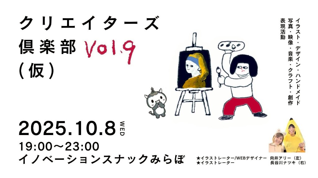 ▼みらぼへのご来店が初めての方は、事前のメンバー登録のご協力をお願い致します。 https://snack-melabo.com/#membership . ●事前登録をして頂きましたら、他に予約等は必要ないので、当日コアタイムまでにお越し下さい✨ ●参加ボタンで参加をお知らせして下さると嬉しいです🥰 . ------------------------------- . ※コアタイムは特に設けていないので、お気軽にお越しください! . . ▼アリーママ・ナツキチーママより \クリエイターズ倶楽部(仮) vol.9/ . イラスト、写真、映像、音楽、ハンドメイド、etc... . つくる人 つくってみたい人 気になってる人 . 話してもいいし、作業してもいいし ただ過ごすだけでもオッケー。 . ✍️ つくる手を動かす 👂️ 誰かの話を聞く 🌱 次を見つける . そんな場になればいいなと思って、 アリーママと、チーママの私で企画しています! . ✔ 創作仲間がほしい ✔ 制作のヒントがほしい ✔ 新しくなにかをはじめたい . こんな方はどうぞふらっと遊びに来てください😁 . . ▼アリーママ×ナツキチーママアーカイブ https://www.instagram.com/p/DDmR01ySLGH/?img_index=1 . ---------- . ◇担当ママ 🎨イラストレーター / Webデザイナー アリーママ ♡神奈川県藤沢市公式マスコットキャラクター「ふじキュン♡」をデザイン。 . ▼プロフィールはこちら https://snack-melabo.com/mamas/ally/ . ▼アリーママアーカイブ https://snack-melabo.com/2023/08/19/allymama-yanaimama/ https://snack-melabo.com/2025/03/19/240727-yanaimama/ https://snack-melabo.com/2023/08/19/allymama-yanaimama/ . . 🎨みらぼチーママ・イラストレーター ナツキ . ▼プロフィールはこちら https://snack-melabo.com/mamas/natsuki/ . ▼なつきチーママアーカイブ https://snack-melabo.com/2024/10/16/240608-natsukichi-mama/ https://snack-melabo.com/2025/03/19/240731-natsukichi-mama/ . ▼IG📷 https://www.instagram.com/natsukihasegawa/ . ---------- . 営業時間◆19:00~23:00 コアタイムなし 営業時間内、自由にフリートーク・交流・創作タイム! . . 料金システム◆ドロップインチャージ1000円+飲み放題2500円〜 ボトル支援5000円~ . ▼料金システムの詳細はこちらから https://snack-melabo.com/howto/ . . ▶ドリンクメニューは、無制限飲み放題。 フードメニューはございません。 お食事をお済ませいただいてからご来店いただくか、 +¥300でお食事お持ち込み可能です。 (ゴミの処分はこちらで承ります。) . ※お支払いは、現金、各種キャッシュレス決済可 (領収書発行致します。) . 皆様のご来店をお待ちしております🌹