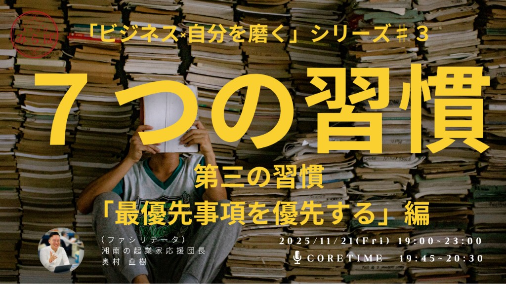 ▼みらぼへのご来店が初めての方は、事前のメンバー登録のご協力をお願い致します。 https://snack-melabo.com/#membership . ●事前登録をして頂きましたら、他に予約等は必要ないので、当日コアタイムまでにお越し下さい✨ ●参加ボタンで参加をお知らせして下さると嬉しいです🥰 .▼みらぼへのご来店が初めての方は、事前のメンバー登録のご協力をお願い致します。 https://s ------------------------------- . ※この日のコアタイムは19:45~20:30になります。 . 中小企業診断士・社会保険労務士 奥村ママの🌹NEWシリーズ🌹✨ . テーマは・・・ 『「ビジネス・自分を磨く」シリーズ#3 【7つの習慣】~第三の習慣「最優先事項を優先する」編~』 . . \奥村ママより/ . このワークショップは、ただの読書会ではありません。 . 世界的ベストセラー『7つの習慣』をベースに、毎回一つの「習慣」を深掘りし、あなたのビジネスに直結する実践的なスキルに落とし込みます。 . 「予習は不要!途中参加も大歓迎です」 . 本を読んでいなくても大丈夫。各回が独立したテーマになっているので、興味のある回にいつでも気軽に参加できます。もし書籍をお持ちの方は、ぜひご持参ください。より理解を深めることができます。 . ママが投げかける問いをもとに、参加者同士で具体的なケーススタディを「壁打ち」し合う実践の場です。自分の言葉で話すことで、考えが整理され、あなたが抱える課題を解決する糸口がきっと見つかります。 . ▼7つの習慣 https://amzn.asia/d/e57KUsP . . ◆担当ママ 湘南労務経営 代表 中小企業診断士 社会保険労務士 奥村直樹ママ https://snack-melabo.com/mamas/okumura/ . . ▼奥村ママのイベントアーカイブはこちら ✅https://www.instagram.com/p/DIdkZT9vTF0/?img_index=1 ✅https://snack-melabo.com/2024/04/23/240418okumura-mama/ ✅https://snack-melabo.com/2025/02/16/240719-okumuramama/ ✅https://snack-melabo.com/2024/04/23/240418okumura-mama/ ✅https://snack-melabo.com/.../30/yamaguchimama-okumuramama/ ✅https://snack-melabo.com/2022/11/21/okumura-mama1118/ . . 営業時間◆19:00~23:00 イベントコアタイム◆19:45~20:30 上記時間以外はフリートーク・交流タイム! . 料金システム◆ドロップインチャージ1000円+飲み放題2500円〜 ボトル支援5000円~ . ▼料金システムの詳細はこちらから https://snack-melabo.com/howto/ . . ▶ドリンクメニューは、無制限飲み放題。 フードメニューはございません。 お食事をお済ませいただいてからご来店いただくか、 +¥300でお食事お持ち込み可能です。 (ゴミの処分はこちらで承ります。) . ※お支払いは、現金、各種キャッシュレス決済可 (領収書発行致します。) . 皆様のご来店をお待ちしております🌹