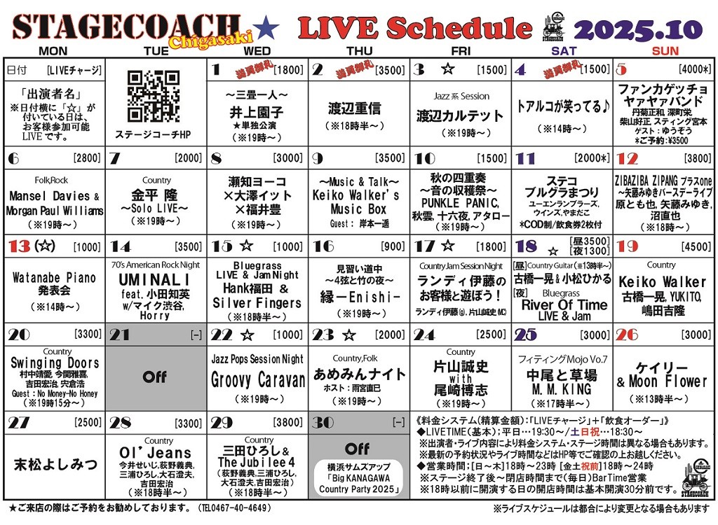 10月22日(水)~10月29日(水) 毎日ライブ企画開催! 詳細はHPのスケジュールをご確認下さい。 ↓ https://www.stage-coach.net/Schedule.html