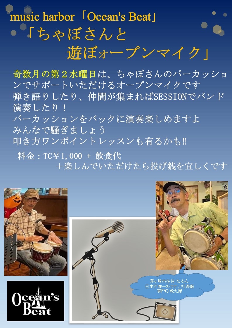 奇数月の第2水曜日は、 加藤ちゃぼさんのパーカッションでサポートいただけるオープンマイクです 弾き語りしたり、仲間が集まればSESSIONで バンド演奏したり! パーカッションをバックで演奏が楽しめますよ みんなで騒ぎましょう 叩き方ワンポイントレッスンも有るかも‼ 料金:TC¥1,000 + 飲食代 +楽しんでいただけたら投げ銭を 宜しくです