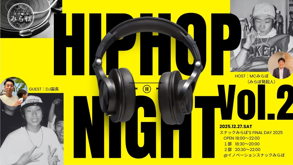 ▼みらぼへのご来店が初めての方は、事前のメンバー登録のご協力をお願い致します。 https://snack-melabo.com/#membership . ●事前登録をして頂きましたら、他に予約等は必要ないので、当日コアタイムまでにお越し下さい✨ ●参加ボタンで参加をお知らせして下さると嬉しいです🥰 . ------------------------------- . ※この日のコアタイムは、 1部|18:30〜20:00 2部|20:30〜22:00 です。 . . 🎤みらぼ発起人 鈴木より 2025年みらぼ最終日はこちら!! みらぼでHIPHOPナイトvol.2🔥 2025年の締めくくりは、 やっぱり “あの夜” しかないでしょ。 私がどうしてもやりたいって思われているかもですけどね。 アンケートの結果ですからね(笑) 前回のvol.1から半年。 スナックみらぼがHIPHOPで再び沸きます!! 今回も二部構成で開催! HIPHOPだけでなく、平成HITも! あの頃の曲を聴いて、懐かしさを噛みしめましょ~ . 全部さらけ出して、笑って、2025年を締めくくろう。 「どう最近、夢、語ってる?」 そんなあなたを、みらぼで待ってる。 . ぜひ遊びにきてね🎤 ------------------------------- . ◆担当 みらぼ発起人 鈴木 https://snack-melabo.com/mamas/suzuki/ . ゲストDJ 園長 . Wチーママ(なつき&ももこ) . . 営業時間◆18:00~22:00 コアタイム 1部|18:30〜20:00 2部|20:30〜22:00 . . 料金システム▶ドロップインチャージ1000円+飲み放題2500円〜 支援ボトル5000円~(支援ボトル大歓迎😁💖) . 【学割】 専門学生/大学生/院生の方 通常料金1000円引き ※学割の適用には、学生証のご提示をお願いしております 【こども料金について】 未就学児 無料 小学生 1000円 中学生 1500円 高校生 2000円 . ▼料金システムの詳細はこちらから https://snack-melabo.com/howto/ . . ▶ドリンクメニューは、無制限飲み放題。 フードメニューはございません。 お食事をお済ませいただいてからご来店いただくか、 +¥300でお食事お持ち込み可能です。 (ゴミの処分はこちらで承ります。) . ※お支払いは、現金、各種キャッシュレス決済可 (領収書発行致します。) . 皆様のご来店をお待ちしております🌹