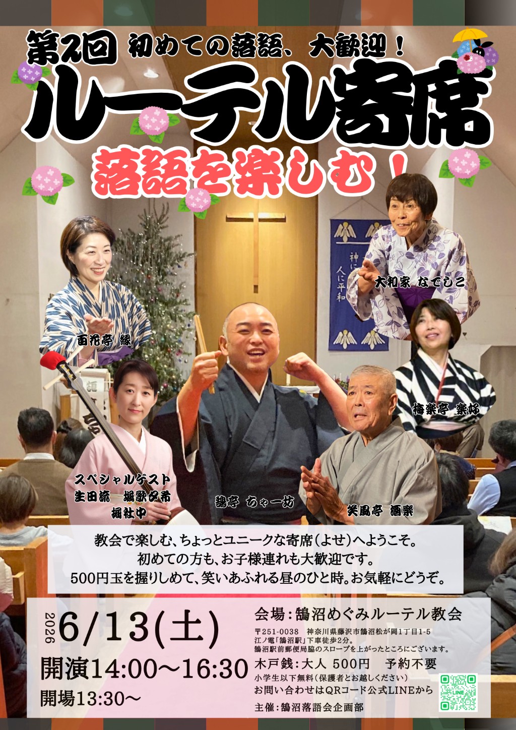 第2回 ルーテル寄席 〜初めての落語、大歓迎!〜 教会で楽しむ、ちょっとユニークな寄席(よせ)へようこそ。初めての方も、お子様連れも大歓迎です。 500円玉を握りしめて、笑いあふれる昼のひと時。お気軽にどうぞ。 開催概要 日時:2026年6月13日(土) 時間:開演 14:00〜16:30(開場 13:30〜) 会場:鵠沼めぐみルーテル教会 木戸銭 (料金) 大人:500円 子供:小学生以下無料 (保護者とお越しください) 出演者 百花亭 縁 梅楽亭 楽好 大和家 なでしこ 笑風亭 酒樂 堀 歌夕希 堀社中 鵠亭 ちゃー坊