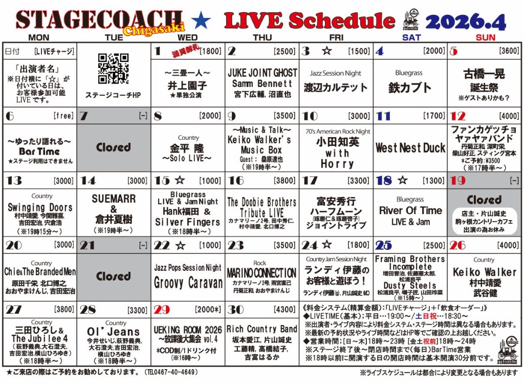 4月8日(水)~4月18日(土) 毎日ライブ企画開催! 詳細はHPのスケジュールをご確認下さい。 ↓ https://www.stage-coach.net/Schedule.html