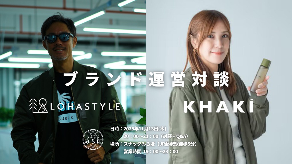 ▼みらぼへのご来店が初めての方は、事前のメンバー登録のご協力をお願い致します。 https://snack-melabo.com/#membership . ●事前登録をして頂きましたら、他に予約等は必要ないので、当日コアタイムまでにお越し下さい✨ ●参加ボタンで参加をお知らせして下さると嬉しいです🥰 . ------------------------------- . ※この日のコアタイムは、20:00~です。 . . アツシママ、11月のテーマは・・・ 『ブランド運営対談:LOHASTYLE meets KHAKI』 湘南・藤沢の「スナックみらぼ」にて、ブランド同士の特別対談を開催! . . \アツシママより/ . 今回のゲストは、メンズスキンケアブランド KHAKI のディレクター・藤井さん。 LOHASTYLE代表・山本がホストとして、 「企画とモノづくり」「ファンを大切にすること」「メディア露出」「オフラインイベント出店」など、 ブランド運営のリアルを語り合います。 . ブランドを運営する方やクリエイティブに関わる方、 もちろんKHAKI・LOHASTYLEをご存じの方も大歓迎! トーク後にはQ&Aタイムもありますので、お気軽にご参加ください。 . ▼KHAKIについて アクティブなメンズのためのスキンケアを展開。 1年中紫外線を浴びる湘南のメンズにオススメのブランドです! https://www.khaki.jp/ . . ▼LOHASTYLE ✅https://lohastyle-shonan.com/ . ▼LOHASTYLE Instagram ✅https://www.instagram.com/lohastyle_shonan?utm_source=ig_web_button_share_sheet&igsh=ZDNlZDc0MzIxNw== . ---------- . ◇◆◇アツシママよりメッセージ◇◆◇ モノづくりもブランド運営も、根っこは「やり切る力」だと思っています。 お客様の声を聞き、数字と向き合い、より良いモノを企画する——そんな日々の中で学んだことを、少しでもシェアできたら嬉しいです。 . . . ◆担当ママ Surf Camp Style株式会社 代表取締役 LOHASTYLE 代表兼デザイナー 山本 淳士 ママ https://snack-melabo.com/mamas/atsushi/ . . 営業時間◆19:00~23:00 語り合いタイム◆20:00~21:00 上記の時間以外はフリートーク・交流タイム! . . 料金システム▶ドロップインチャージ1000円+飲み放題2500円〜 支援ボトル5000円~ . ▼料金システムの詳細はこちらから https://snack-melabo.com/howto/ . . ▶ドリンクメニューは、無制限飲み放題。 フードメニューはございません。 お食事をお済ませいただいてからご来店いただくか、 +¥300でお食事お持ち込み可能です。 (ゴミの処分はこちらで承ります。) . ※お支払いは、現金、各種キャッシュレス決済可 (領収書発行致します。) . 皆様のご来店をお待ちしております🌹✨