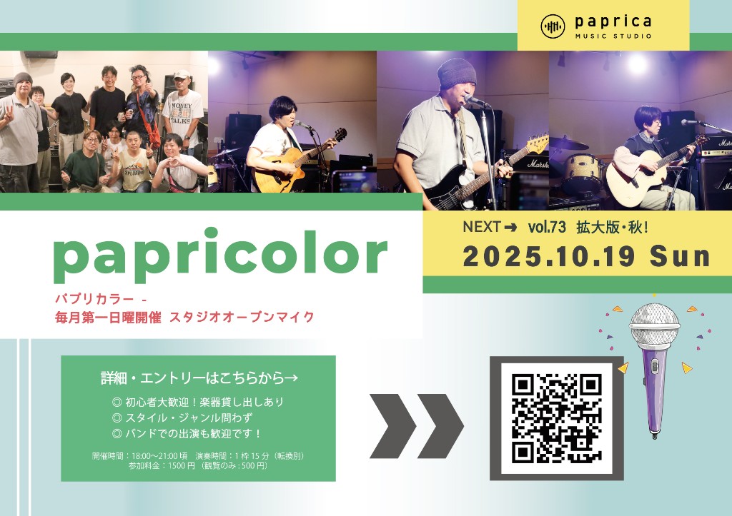 月1開催をしておりますが、おかげさまで満員続き! 「参加したいのに入れなかった〜!」という方が増えてしまったため、追加・拡大版を開催します!💪 スタート時刻がいつもより早くなりますのでご注意ください🎤 ----- ▼エントリー https://paprica.studio/item/papricolor-vol-73/ 受付:17:30〜 スタート:18:00 演奏参加(15分転換別):1500円/1名 観覧のみ:500円/1名 ・お申し込みを頂き次第エントリー確定とさせていただきます。基本的に折り返しのご連絡は省略させていただいておりますので、そのまま当日お越しください。 ・人数は、現段階で分かっている内容でお申し込み頂いて大丈夫です。お支払い前でしたら人数変更は後からでも可能です。 ・観覧のみの方はご予約不要です。 当日受付にお申し付けください。 5名以上のグループ等でお越しの場合は事前にご一報頂けると安心です。 ・駐車場は一般のスタジオ予約のお客さまがご利用になる為、オープンマイクご参加の方はお使い頂けません。 コインパーキング等をご利用ください。 ----- ▼ツイキャス無料配信あり https://twitcasting.tv/paprica_studio ・出演時、配信や撮影を希望されない場合はお申し付けください。