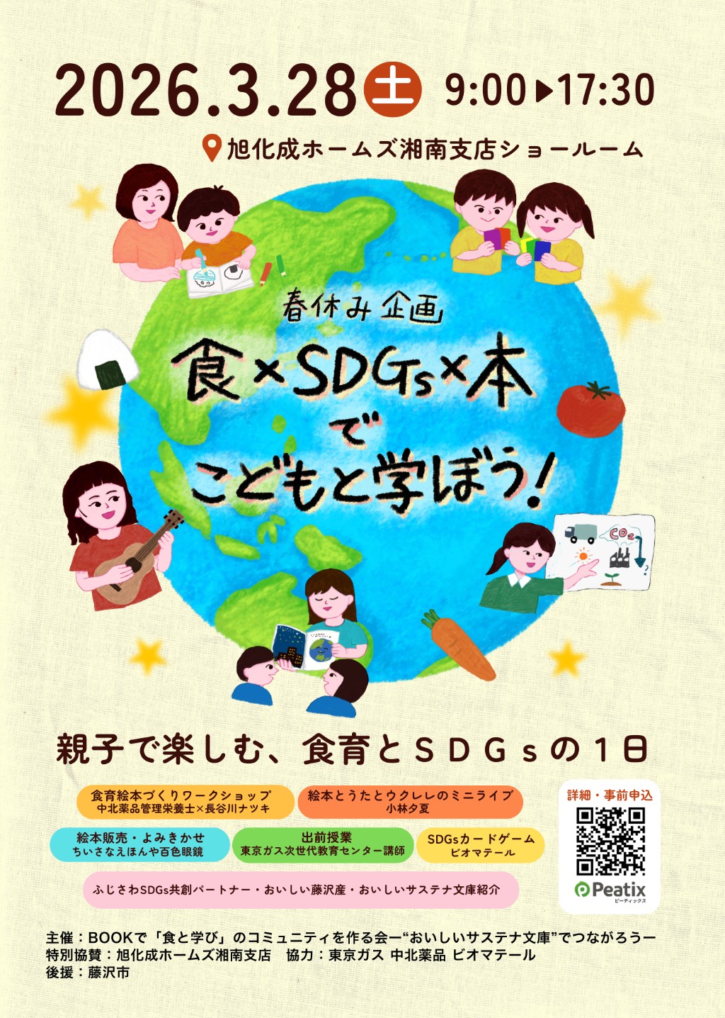 ~春休みの探究活動にぴったり! 食×SDGs×本でこどもと学ぼう~ 春休みの1日「食べること」から未来のことを親子で考えてみませんか? 藤沢市後援のもと、地域でSDGsに取り組む企業・団体の協力により開催する、少人数制の体験型イベントです。創造力を養うワークショップ、ミニライブ、カードゲーム体験など五感で楽しみながら学べる1日です。 無料で自由に入場できる絵本販売・展示ブースもあり、1日通してお楽しみいただけます。