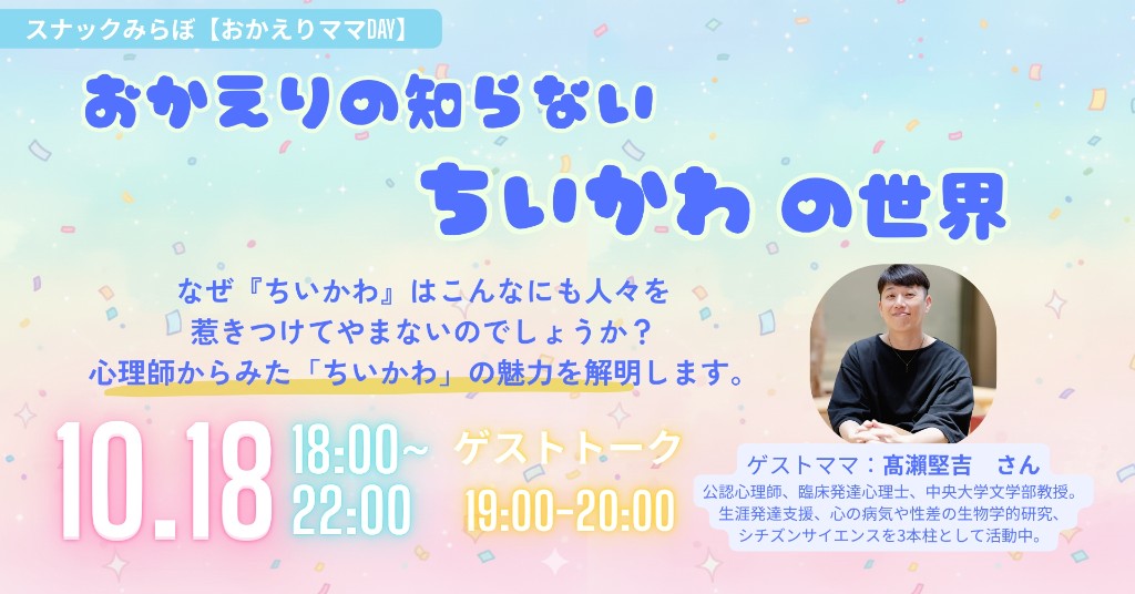 ▼みらぼへのご来店が初めての方は、事前のメンバー登録のご協力をお願い致します。 https://snack-melabo.com/#membership . ●事前登録をして頂きましたら、他に予約等は必要ないので、当日コアタイムまでにお越し下さい✨ ●参加ボタンで参加をお知らせして下さると嬉しいです🥰 . ------------------------------- . ※土曜日ですので18時オープン22時クローズとなります。 ※この日のコアタイムは、19時~です。 . 岡えりママの知らない世界シリーズ🌎 今回のテーマは・・・ 『おかえりの知らない【ちいかわ】の世界』 なぜ、『ちいかわ』はこんなにも人々を 惹きつけてやまないのでしょうか? 心理士から見た『ちいかわ』の魅力を解明します。 . . “なぜ人はちいかわに癒されるのか?” . 今回は、 ゲストママの臨床発達心理士・高瀬賢吉さんが、 心理学の視点からその魅力を解き明かします。 . . 🔹こんな方におすすめ🔹 ・心理学や発達の分野に関心がある方 ・教育・福祉・カウンセリングなど、人と関わる仕事をしている方 ・子育て中で、子どもの気持ちや心の発達に興味がある方 ・「ちいかわ」の人気の理由を心理的に紐解いてみたい方 . かわいいの裏にある“こころの世界”を、一緒にのぞいてみませんか? . . 【お子様連れ】・初参加・お一人参加も大歓迎です🫡 . ※子供料金について ・未就学児 無料 ・小学生 →ドロップイン料金1000円 . . ◇ゲストママ 高瀬 賢吉 さん https://takaselab.r.chuo-u.ac.jp/ 公認心理師、臨床発達心理士、中央大学文学部教授。 生涯発達支援、心の病気や性差の生物学的研究、 シチズンサイエンスを3本柱として活動中。 . ◇担当ママ 株式会社Lively 代表取締役社長 CEO 岡えりママ https://snack-melabo.com/mamas/okaeri/ . ●LivelyTalk(ライブリートーク)とは? 1対3までの少人数に特化したライブコミュニケーションサービスです https://www.lively-talk.com/service . . ▼岡えりママのイベントアーカイブはこちら ✅https://www.instagram.com/p/DHGChfYPC0c/?img_index=1 ✅https://snack-melabo.com/2024/06/28/20240518-okaerimama/ . . 営業時間◆18:00~22:00 イベントコアタイム◆19:00~20:00 上記時間以外はフリートーク・交流タイム! . 料金システム◆ドロップインチャージ1000円+飲み放題2500円〜 ボトル支援5000円~ . ▼料金システムの詳細はこちらから https://snack-melabo.com/howto/ . . ▶ドリンクメニューは、無制限飲み放題。 フードメニューはございません。 お食事をお済ませいただいてからご来店いただくか、 +¥300でお食事お持ち込み可能です。 (ゴミの処分はこちらで承ります。) . ※お支払いは、現金、各種キャッシュレス決済可 (領収書発行致します。) . 皆様のご来店をお待ちしております🌹