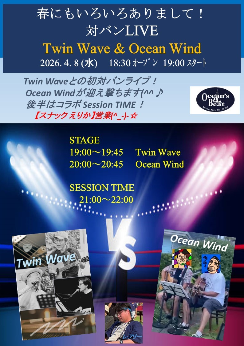 中山さん・山ちゃんのTwin Waveとケンショウ&BackyのOcean WindのブッキングLIVEです 18:00 オープン 19:00 スタート Twin Wave Ocean Wind 21:00 コラボセッション スナックえりか営業‼️
