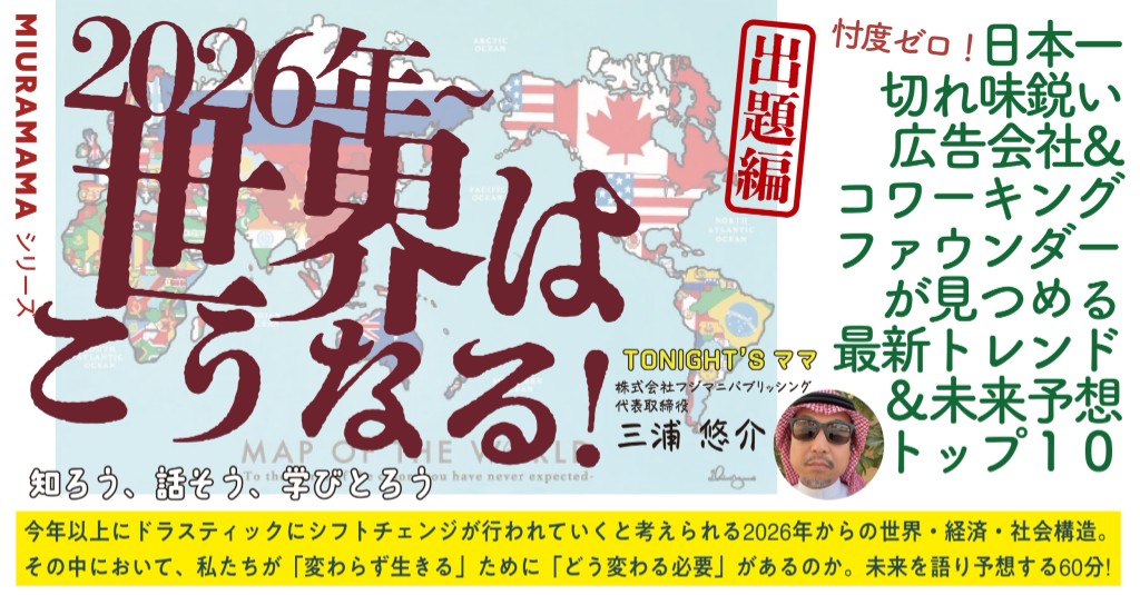 ▼みらぼへのご来店が初めての方は、事前のメンバー登録のご協力をお願い致します。 https://snack-melabo.com/#membership . ●事前登録をして頂きましたら、他に予約等は必要ないので、当日コアタイムまでにお越し下さい✨ ●参加ボタンで参加をお知らせして下さると嬉しいです🥰 . ------------------------------- . ※この日のコアタイムは20:00~になります。 . 三浦ママの~知ろう、話そう、学び取ろうシリーズ~ 第40回目のテーマは・・・ . 2026年~ 世界はこうなる! . と題した、年末振り返り特別企画の未来予想ナイト! . . \三浦ママより/ . 忖度ゼロ!日本一切れ味鋭い 広告会社&コワーキングのファウンダーが見つめる 最新トレンド&未来予想トップ10をお届けします。 . 今年以上にドラスティックにシフトチェンジが行われていくと考えられる2026年からの世界・経済・社会構造。その中において、私たちが「変わらず生きる」ために「どう変わる必要」があるのか。未来を語り予想する60分! . 「信じるか信じないかは、あなた次第です!」😎 . ぜひお楽しみに! . . . ◇担当ママ 株式会社フジマニパブリッシング 代表取締役編集長 三浦悠介 ママ https://snack-melabo.com/mamas/miura/ . . ▼三浦ママのイベントアーカイブはこちら https://snack-melabo.com/2025/03/28/250110-miuramama/ https://snack-melabo.com/2024/12/24/240704-miuramama/ https://snack-melabo.com/2024/10/08/240605-miuramama/ https://snack-melabo.com/2023/09/05/miuramama-tomoemama/ https://snack-melabo.com/2023/03/09/ailove/ https://snack-melabo.com/2023/04/26/230407miura-mama/ https://snack-melabo.com/2023/02/16/20230216gbe/ https://snack-melabo.com/2022/12/16/1202miura-mama/ . . 営業時間◆19:00~23:00 イベントコアタイム◆20:00~21:00 上記時間以外はフリートーク・交流 . 料金システム▶ドロップインチャージ1000円+飲み放題2500円〜 支援ボトル5000円~(支援ボトル大歓迎😁💖) . 【学割】 専門学生/大学生/院生の方 通常料金1000円引き ※学割の適用には、学生証のご提示をお願いしております 【こども料金について】 未就学児 無料 小学生 1000円 中学生 1500円 高校生 2000円 . ▼料金システムの詳細はこちらから https://snack-melabo.com/howto/ . . ▶ドリンクメニューは、無制限飲み放題。 フードメニューはございません。 お食事をお済ませいただいてからご来店いただくか、 +¥300でお食事お持ち込み可能です。 (ゴミの処分はこちらで承ります。) . ※お支払いは、現金、各種キャッシュレス決済可 (領収書発行致します。) . 皆様のご来店をお待ちしております🌹