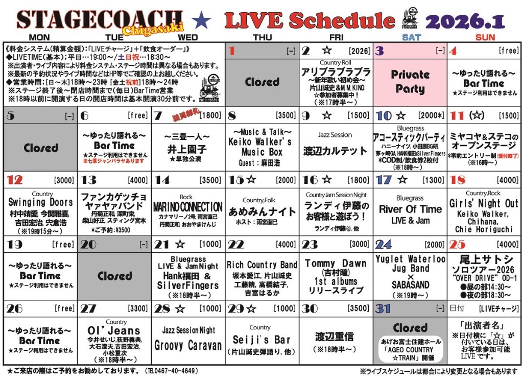 1月7日(水)~1月18日(日) 毎日ライブ企画開催! 詳細はHPのスケジュールをご確認下さい。 ↓ https://www.stage-coach.net/Schedule.html