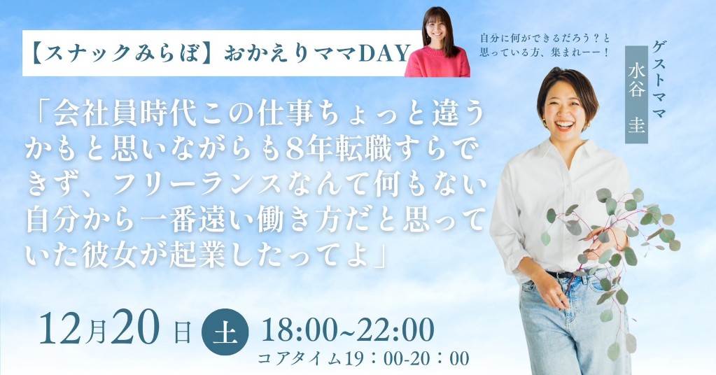 ▼みらぼへのご来店が初めての方は、事前のメンバー登録のご協力をお願い致します。 https://snack-melabo.com/#membership . ●事前登録をして頂きましたら、他に予約等は必要ないので、当日コアタイムまでにお越し下さい✨ ●参加ボタンで参加をお知らせして下さると嬉しいです🥰 . ------------------------------- . ※土曜日ですので18時オープン22時クローズとなります。 ※この日のコアタイムは、19時~です。 . 毎月第3土曜日の岡えりママDAY 今回のテーマは・・・ . 【自分に何ができるだろう?と思っている方、集まれー!】 「会社員時代この仕事ちょっと違うかもと思いながらも8年転職すらできず、フリーランスなんて何もない自分から一番遠い働き方だと思っていた彼女が起業したってよ」 . . ゲストママに、 ウェルビーイング自己理解アドバイザー 水谷 圭(ちゃんけー)さんをお迎えします✨ . ちゃんけーさんは、“自分を知る”ことを通して、心からの幸福感と納得感で満たされる人生をつくるコーチングをされています。 ロンドン生まれ東京育ち、湘南で夫・年子の兄妹と暮らすワーママでもあります。 . 彼女自身、 – 「この仕事ちょっと違うかも…」と思いながらも – 転職すらできずに8年間迷っていた – フリーランスなんて自分には無縁だと思っていた . という道のりを経て、自己理解のプロセスと出会い、 自分らしい働き方を見つけました。 . その結果、 ✔ 会社員からフリーランスへ ✔ 幸福学 × 自己理解 × コーチングの学び ✔ 延べ500人以上に自己理解ワークを伝える経験 というキャリアを歩んでいます。 . 👇こんな方におすすめ ・今の仕事がなんとなくしっくりこない ・自分の働き方・生き方を見つめ直したい ・フリーランスや起業に興味はあるけど一歩踏み出せない ・子育てと自分の時間のバランスに悩んでいる . – 会社員として頑張ってきたけど、 「このままでいいのかな?」と感じたことはありませんか? – 「自分に何ができるんだろう?」 そんな問いを抱えているママさんも。 . 転職もできず、フリーランスなんて無縁だと思っていた彼女が、 一歩踏み出した“リアルな話”を聞ける夜です🌹 . 聞くだけ参加 大歓迎🍷 肩書きや正解を探す場ではなく、 「自分はどう感じているのか」を大切にする時間です。 あなたの“これから”にそっと寄り添う夜を一緒に過ごしませんか? . . ◇ゲストママ ウェルビーイング自己理解アドバイザー 水谷 圭(ちゃんけー)さん https://note.com/chanke1/n/nb1ea4146e466 . ▽ちゃんけーさんInstagram https://www.instagram.com/chanke1_ . . ◇担当ママ 株式会社Lively 代表取締役社長 CEO 岡えりママ https://snack-melabo.com/mamas/okaeri/ . ●LivelyTalk(ライブリートーク)とは? 1対3までの少人数に特化したライブコミュニケーションサービスです https://www.lively-talk.com/service . . ▼岡えりママのイベントアーカイブはこちら ✅https://www.instagram.com/p/DHGChfYPC0c/?img_index=1 ✅https://snack-melabo.com/2024/06/28/20240518-okaerimama/ . . 営業時間◆18:00~22:00 イベントコアタイム◆19:00~20:00 上記時間以外はフリートーク・交流タイム! . 料金システム◆ドロップインチャージ1000円+飲み放題2500円〜 ボトル支援5000円~(支援ボトル大歓迎😁💖) . 【学割】 専門学生/大学生/院生の方 通常料金1000円引き ※学割の適用には、学生証のご提示をお願いしております 【こども料金について】 未就学児 無料 小学生 1000円 中学生 1500円 高校生 2000円 . ▼料金システムの詳細はこちらから https://snack-melabo.com/howto/ . . ▶ドリンクメニューは、無制限飲み放題。 フードメニューはございません。 お食事をお済ませいただいてからご来店いただくか、 +¥300でお食事お持ち込み可能です。 (ゴミの処分はこちらで承ります。) . ※お支払いは、現金、各種キャッシュレス決済可 (領収書発行致します。) . 皆様のご来店をお待ちしております🌹