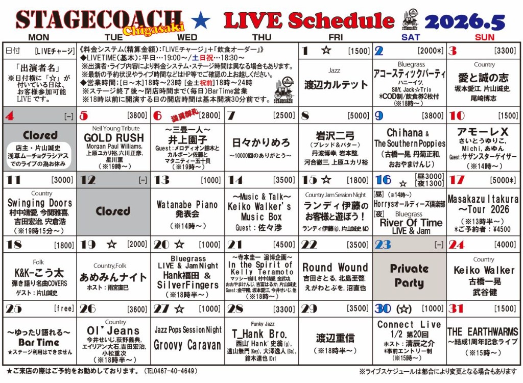 5月5日(火祝)~5月11日(月) 毎日ライブ企画開催! 詳細はHPのスケジュールをご確認下さい。 ↓ https://www.stage-coach.net/Schedule.html