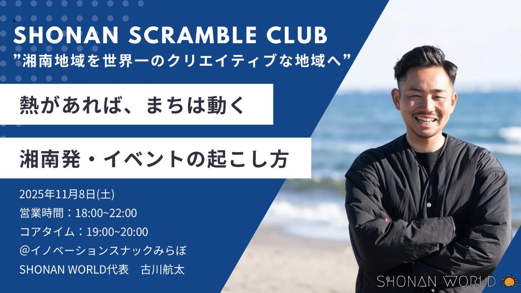 ▼みらぼへのご来店が初めての方は、事前のメンバー登録のご協力をお願い致します。 https://snack-melabo.com/#membership . ●事前登録をして頂きましたら、他に予約等は必要ないので、当日コアタイムまでにお越し下さい✨ ●参加ボタンで参加をお知らせして下さると嬉しいです🥰 . ------------------------------- . ※土曜日ですので18時オープン22時クローズとなります。 ※この日のコアタイムは、19時~です。 . \KOTAママより/ . 4月から毎月、いろんなクリエイティブなゲストをお迎えしてきましたが、今回はついに、3月ぶりに、KOTAママソロ回です🔥 . テーマは「イベントの起こし方」。 . これまで地域でいくつものイベントを企画・運営してきた経験から、 . ・イベントってどうやって立ち上がるの? ・やってみて楽しい瞬間と、大変な現実 ・仲間をどうやって巻き込む? . そんなリアルな“現場トーク”をゆるっと本音で話したいと思います🎤 . 次回は11月15日、鵠沼海浜公園HUG-RIDE PARKで 「SHONAN SCRAMBLE FESTIVAL’25」も開催予定! その裏話も交えながら、 「熱があれば、まちは動く」をテーマに語り合いましょう🔥 . 「いつか自分もイベントをやってみたい」 「地域で何かを起こしたい」 . そんな想いを持つみなさん、大歓迎です! 初めての方もお気軽にお越しください! . ここからまた、次の動きが生まれたら最高です! 湘南の“熱い夜”を一緒に過ごしましょう🍻🔥 . ⸻ . ▼KOTAママの運営する SHONAN WORLDとは? . 湘南を世界一のクリエイティブな地域へ。 そのビジョンのもと、湘南を拠点に イベントプロデュース を行っています。 . ✅ フェスティバルの企画・運営 (例:SHONAN SCRAMBLE FESTIVAL など) ✅ 地域と連携したマルシェやパーティーの開催 ✅ アーティストや企業と協働するイベントのプロデュース . . 【メディア出演・今後の活動】 ✅ YouTube番組『令和の虎』出演(史上最速オール獲得) https://youtu.be/P6EF5RZFMjA?si=OQMdGKbuovYezuWv ✅ 2025年夏頃に法人設立予定 ✅ 2025年秋頃にSHONAN SCRAMBLE FESTIVAL'25 開催予定 . ⸻ . ◇◆◇KOTAママよりメッセージ◇◆◇ 人と人が繋がる瞬間が大好きです。その中で生まれるワクワクを、湘南から世界に広げたいと思っています。一緒に面白いことを作り出しましょう! . . ◆担当ママ SHONAN WORLD 代表 古川航太 ママ https://snack-melabo.com/mamas/kota/ . ▼KOTAママのイベントアーカイブ ✅https://snack-melabo.com/2025/05/30/250308-kotamama/ . . 営業時間◆18:00~22:00 イベントコアタイム◆19:00~20:00 上記時間以外はフリートーク・交流タイム! ※土曜日ですので18時オープン22時クローズとなります。 . 料金システム◆ドロップインチャージ1000円+飲み放題2500円〜 ボトル支援5000円~ . ▼料金システムの詳細はこちらから https://snack-melabo.com/howto/ . . ▶ドリンクメニューは、無制限飲み放題。 フードメニューはございません。 お食事をお済ませいただいてからご来店いただくか、 +¥300でお食事お持ち込み可能です。 (ゴミの処分はこちらで承ります。) . ※お支払いは、現金、各種キャッシュレス決済可 (領収書発行致します。) . 皆様のご来店をお待ちしております🌹