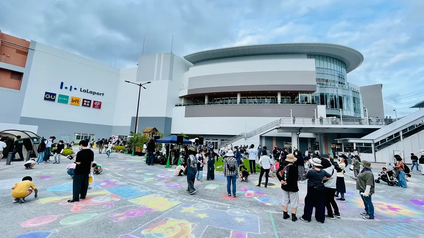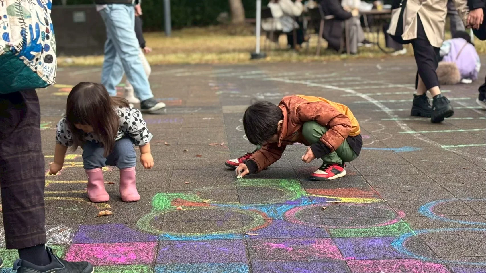 (神奈川・海老名の扇町アウトドアパークでチョークアートを楽しむ人々)
