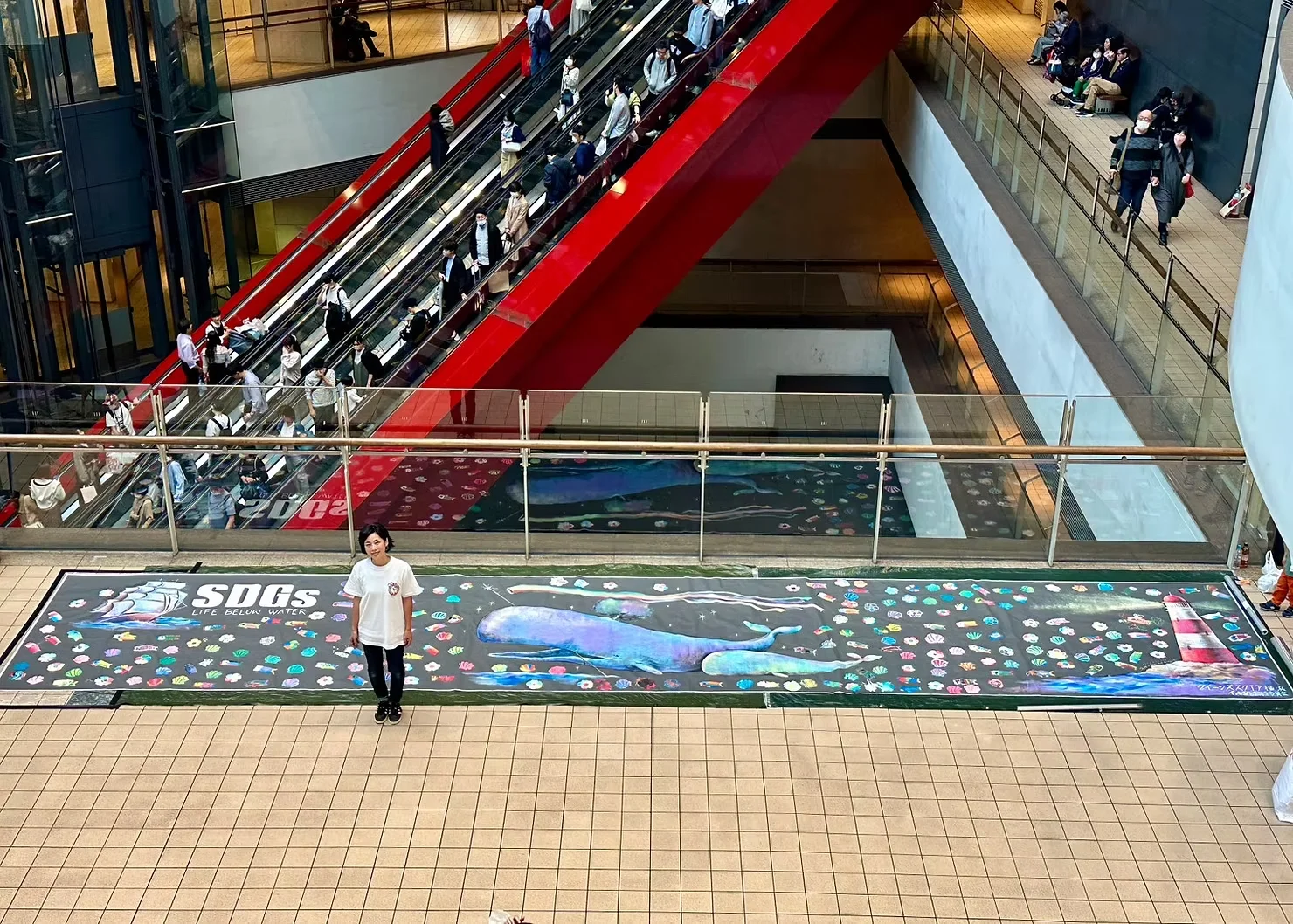 これが大反響を呼び、2023年にはみなとみらいのクイーンズスクエア横浜で、総勢200名の子供たちとの協働で10メートルのクジラの巨大チョークアートが誕生。