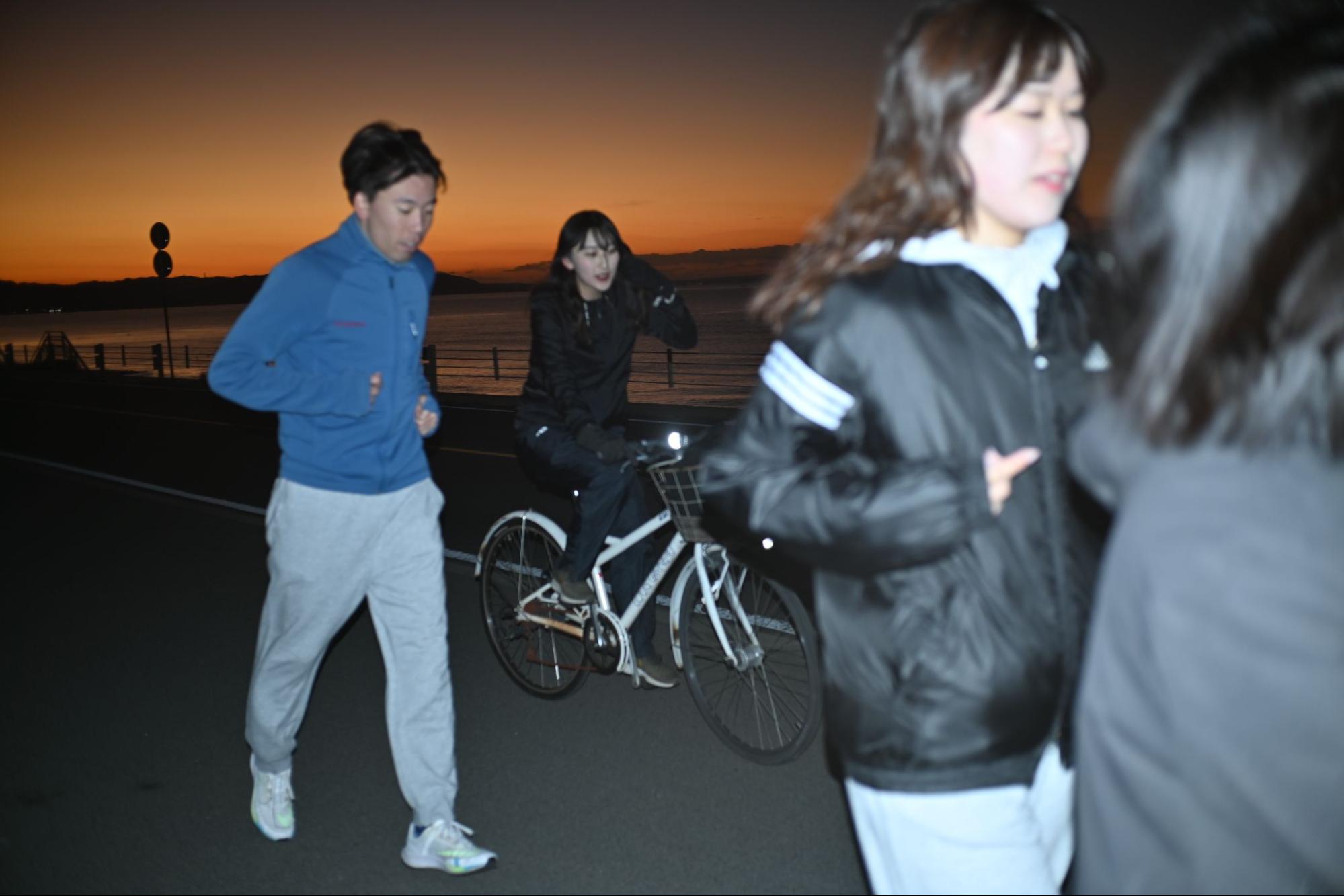 朝焼けに照らされるランナーたちの姿、笑顔で会話する参加者、湘南の美しい景色。